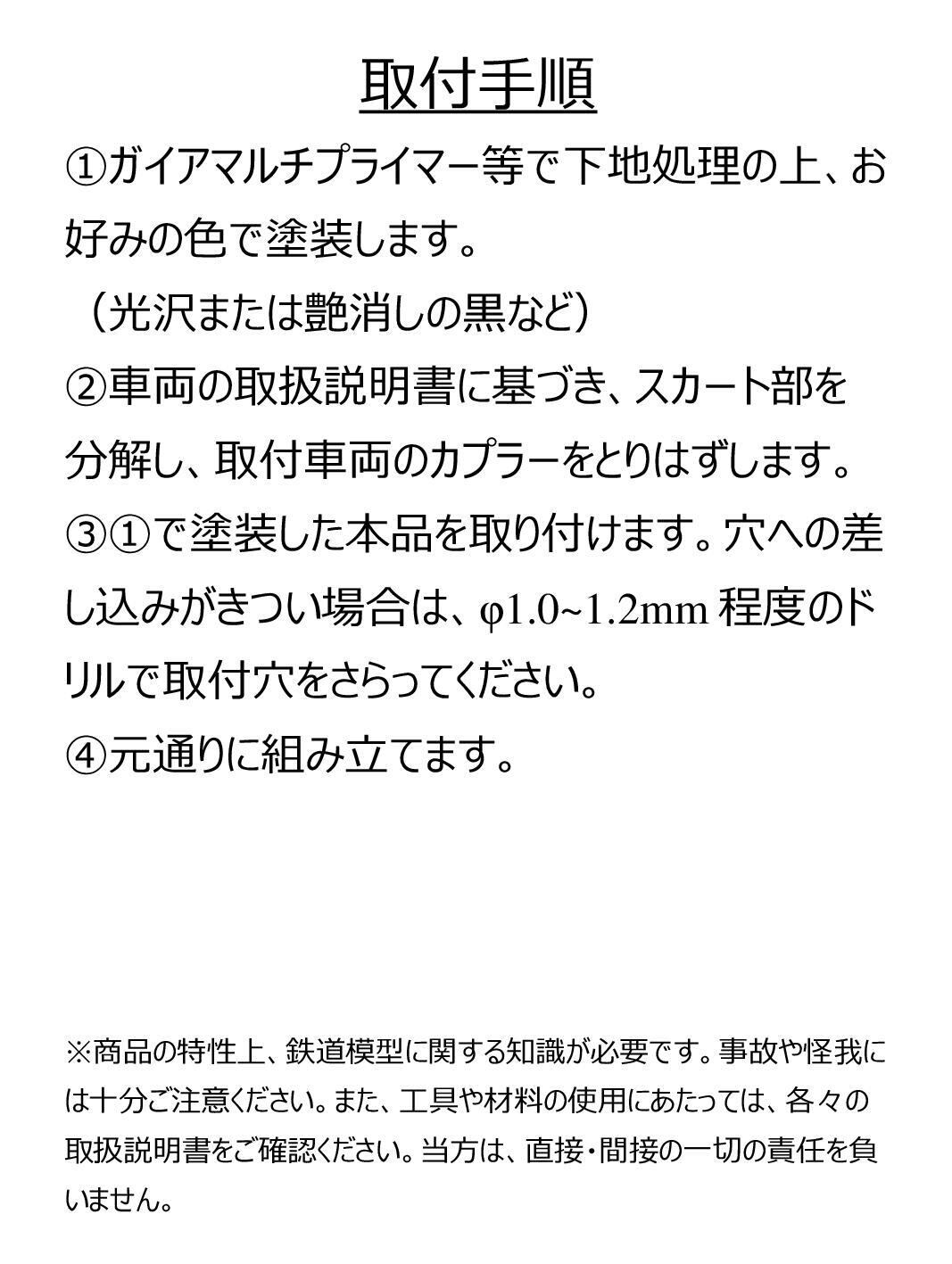 製作は、紫外線硬化樹脂にて3Dプリントしてあり、下地処理・塗装の上、KATOの対応製品などに組込可能です。(純正カプラーと取り付け互換なので、車両の加工・接着など不要で、取り付け後に元に戻すこともできます。)